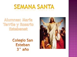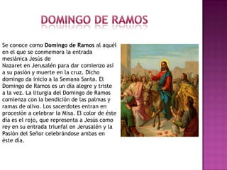 El documento resume las principales celebraciones de la Semana Santa, incluyendo el Domingo de Ramos que marca el inicio, el Jueves Santo en que se conmemora la Última Cena, el Viernes Santo centrado en la crucifixión, y el Domingo de Pascua en que se celebra la resurrección de Jesús.