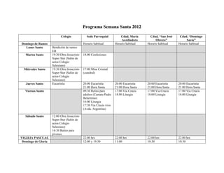 El documento presenta el programa de actividades religiosas para la Semana Santa del año 2012 en 4 comunidades: la Parroquia, la Ciudad María Auxiliadora, la Ciudad "San José Obrero" y la Ciudad "Domingo Savio". Se detallan las misas, obras teatrales, procesiones y retiros espirituales que tendrán lugar entre el Domingo de Ramos y el Domingo de Gloria.