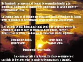 La Semana Santa conmemora la pasión, muerte y resurrección de Cristo a través de varios días litúrgicos clave. Comienza con el Domingo de Ramos que recuerda la entrada triunfal de Jesús a Jerusalén. Luego está el Jueves Santo que celebra la Última Cena. El Viernes Santo se enfoca en la crucifixión. El Sábado Santo es un día de silencio esperando la resurrección, la cual se conmemora especialmente el Domingo de Resurrección.