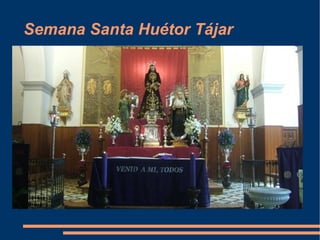 Este documento describe las diferentes procesiones y celebraciones que tienen lugar durante la Semana Santa en la localidad de Huétor Tájar, Granada. Detalla las distintas imágenes religiosas que procesionan cada día, como Jesús Nazareno el Jueves Santo, el Santo Sepulcro y la Virgen de los Dolores el Viernes Santo, y Jesús Resucitado el Domingo de Resurrección. También habla sobre la importancia de esta celebración anual para los residentes y cómo preparan las distintas actividades y procesiones a través