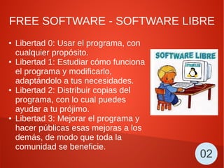 El documento introduce los conceptos de software libre y de código abierto, describiendo las cuatro libertades del software libre, los principios del código abierto y las diferencias entre ambos. También resume las organizaciones FSF y OSI dedicadas a promover el software libre y de código abierto, así como distribuciones y proyectos populares de GNU/Linux.