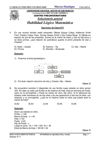 Este documento presenta un solucionario de ejercicios de habilidad lógico matemática con 14 problemas resueltos. Cada problema presenta una situación o pregunta sobre relaciones familiares, distancias, ángulos, entre otros, junto con las posibles respuestas. Luego, se muestra la solución detallada para llegar a la respuesta correcta.