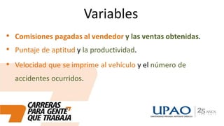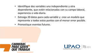 Este documento presenta información sobre una lección de estadística. Incluye un pensamiento sobre la felicidad y el éxito, un enlace a un video sobre variables, y tareas para los estudiantes como analizar datos usando medidas y gráficas de correlación y regresión, y publicar conclusiones sobre cómo se aplica el tema a su experiencia laboral.