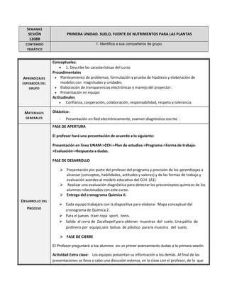 El documento presenta la primera sesión de una unidad sobre el suelo y los nutrientes para las plantas. Se describen los objetivos de aprendizaje, como identificar características del suelo y elaborar modelos. Los estudiantes realizarán una presentación y una salida de campo para obtener muestras de suelo. Deberán investigar y presentar informes en un blog.