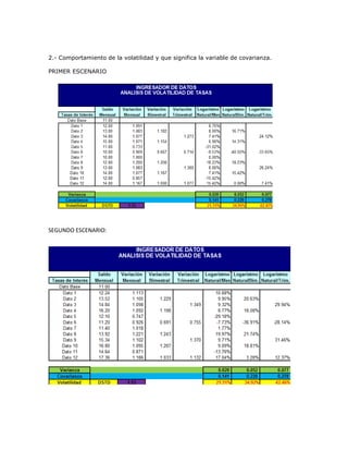 El documento discute tres temas: 1) Cómo los cambios en el pronóstico del tipo de cambio afectan la varianza y desviación estándar. 2) El comportamiento de la volatilidad y el significado de la covarianza. 3) Cuál acción tiene mayor nivel de riesgo y la correlación. Explica que un tipo de cambio más alto aumenta los costos de las actividades financieras internacionales, que la volatilidad se mantiene similar a pesar de cambios pequeños en el saldo mensual, y que la correlación mide la dependencia entre