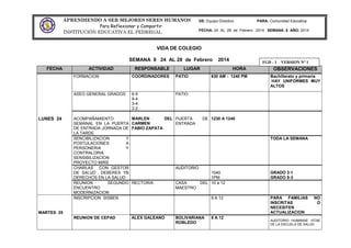El documento presenta cinco claves para ser un buen compañero de trabajo, incluyendo relacionarse con todos los compañeros, ser abiertos al trabajo en equipo, dar la bienvenida a nuevos miembros, hacer críticas constructivas, y escuchar y agradecer críticas. También incluye el cronograma de actividades de una semana en una institución educativa con eventos como formación, aseo, reuniones, y entrega de evaluaciones.