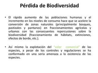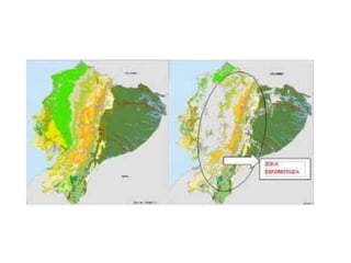 El documento describe la alta biodiversidad de Ecuador y las amenazas a su conservación. Ecuador tiene una de las mayores diversidades de plantas y animales del mundo debido a su ubicación ecuatorial y diversos ecosistemas como la Amazonía y los Andes. Sin embargo, la deforestación, especies invasoras, contaminación y cambio climático están acelerando la pérdida de biodiversidad, con miles de especies en peligro de extinción. El gobierno ecuatoriano ha establecido instituciones para monitorear y proteger la rica herencia