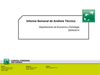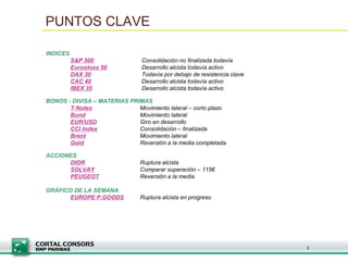 Este informe semanal de análisis técnico resume las tendencias alcistas y laterales de varios índices como el S&P 500, Eurostoxx 50, DAX 30 y CAC 40. También analiza los movimientos laterales de los bonos alemanes y estadounidenses, así como la tendencia alcista del oro y las materias primas. Por último, recomienda comprar acciones como Dior, Solvay y el sector de bienes de consumo europeo.