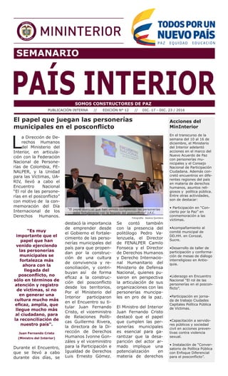 El Ministerio del Interior llevó a cabo varias acciones para implementar el Acuerdo de Paz, incluyendo reuniones con personerías municipales y el Consejo Nacional de Participación Ciudadana para discutir su papel en el posconflicto. También realizó encuentros en diferentes regiones sobre derechos humanos, asuntos religiosos y política pública, y capacitaciones sobre prevención de violencia sexual.