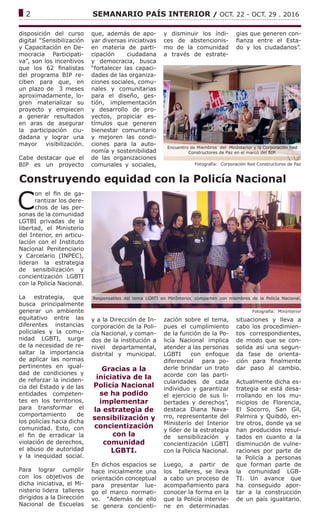 El documento resume las iniciativas del Ministerio del Interior y la Corporación Red Constructores de Paz para fortalecer la democracia participativa en Colombia, incluyendo el apoyo a 62 proyectos de organizaciones sociales a través del Banco de Iniciativas de Participación Ciudadana y la implementación de estrategias de sensibilización con la Policía Nacional para proteger los derechos de la comunidad LGBTI. También describe los talleres que la Dirección de Derechos Humanos del Ministerio lleva a cabo en todo el país para promover una cultura de respeto