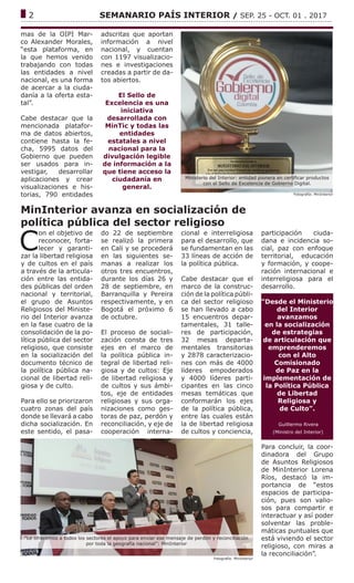 El Ministerio del Interior lideró varias acciones para implementar el Acuerdo de Paz como instalar el Comité de Garantías Electorales para la Unión Patriotica y acompañar procesos en San Andrés y Cauca. También avanzó en socializar la política pública del sector religioso en cuatro regiones del país y fue reconocido como pionero en certificar datos abiertos con el Sello de Excelencia de Gobierno Digital.
