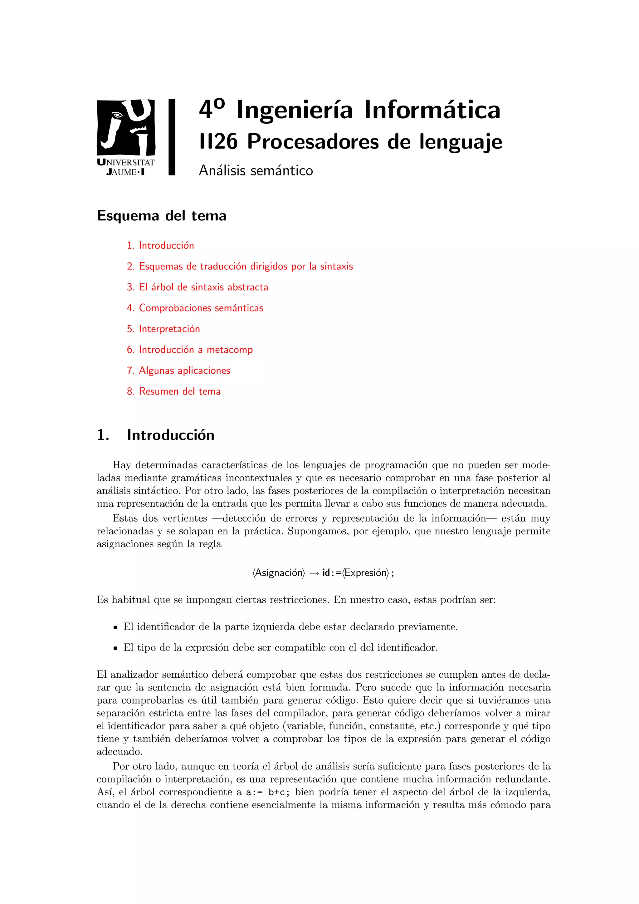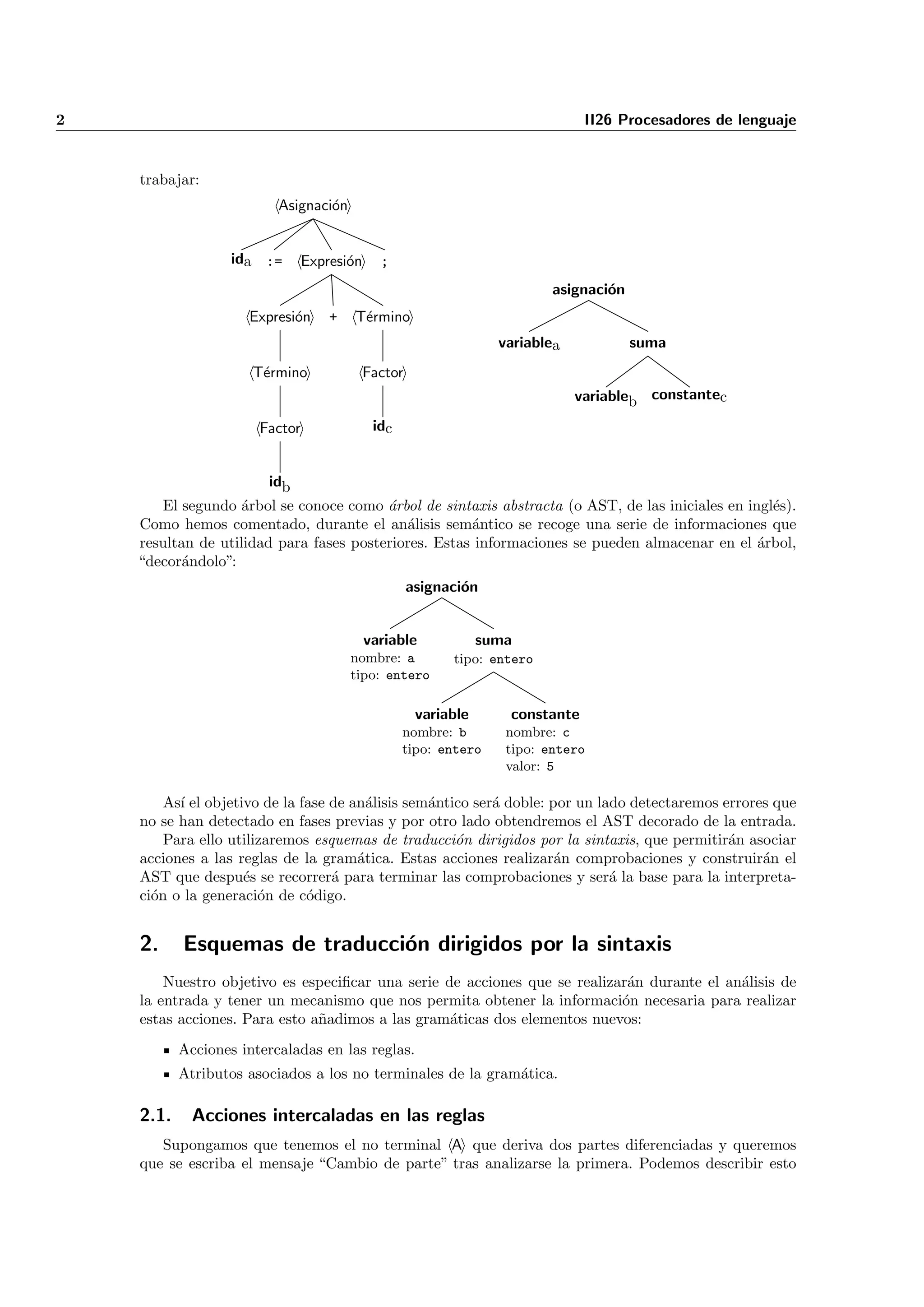 Este documento describe el análisis semántico en los procesadores de lenguaje. Explica que el análisis semántico detecta errores que no fueron detectados sintácticamente y obtiene un árbol de sintaxis abstracta decorado con información. También utiliza esquemas de traducción dirigidos por la sintaxis que asocian acciones a las reglas gramaticales para realizar comprobaciones y construir el árbol.