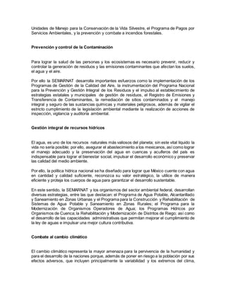 La SEMARNAT es la dependencia del gobierno mexicano encargada de proteger el medio ambiente y recursos naturales del país. Para lograr la sustentabilidad, la SEMARNAT trabaja en cuatro áreas principales: conservación de ecosistemas y biodiversidad, prevención de contaminación, gestión de recursos hídricos y combate al cambio climático. Algunos de los programas e instrumentos clave son Áreas Protegidas Federales, gestión de calidad del aire y agua, y el Programa Especial de Cambio Climático.