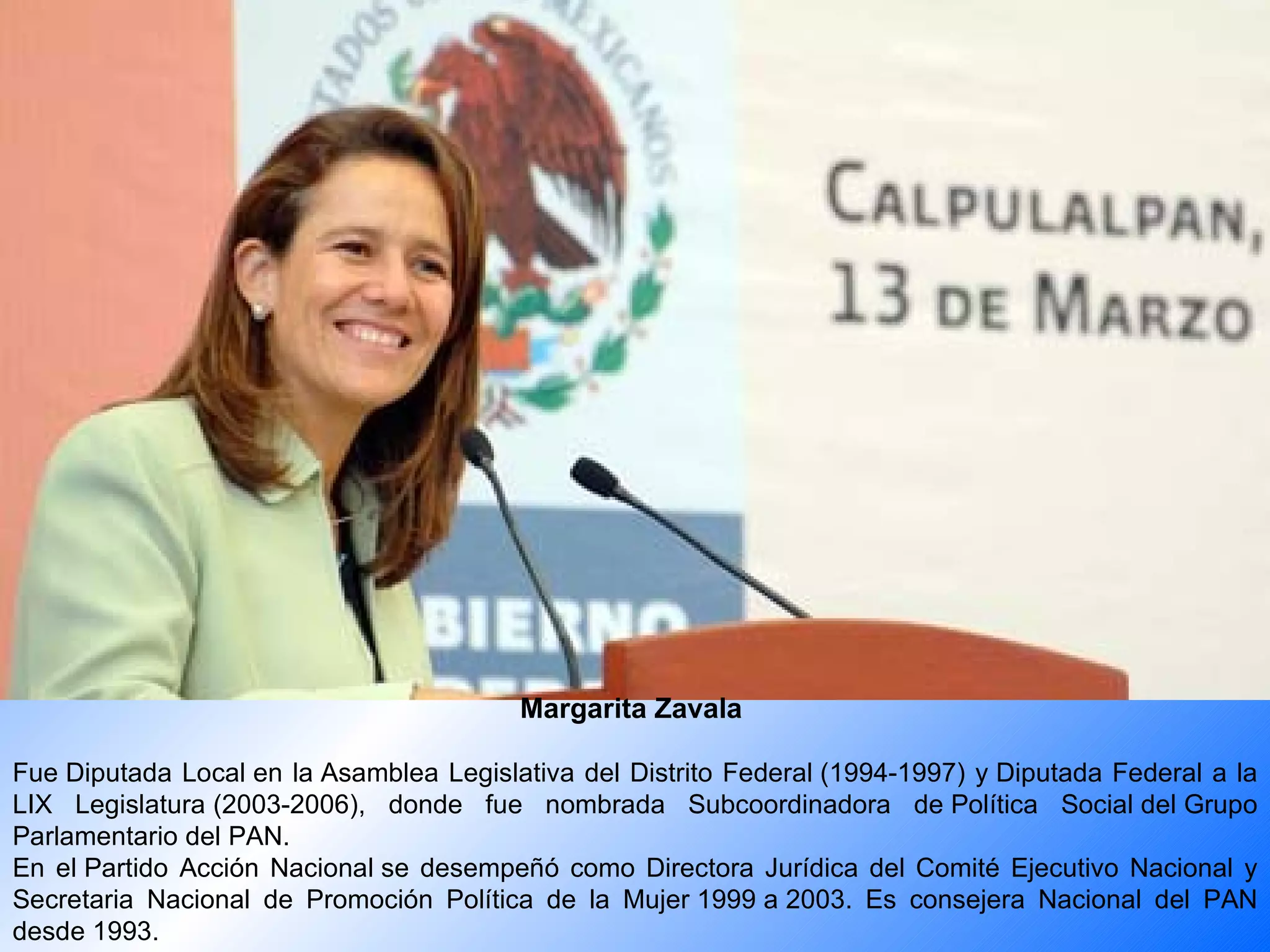 El documento presenta breves resúmenes biográficos de 8 políticas mexicanas miembros del Partido Acción Nacional (PAN). Todas han ocupado cargos como diputadas locales o federales y han participado en comités ejecutivos del PAN. Algunas han sido presidentas de la cámara de diputados, senadoras o jefas delegacionales.