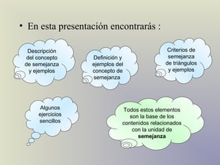 El documento describe el concepto de semejanza de figuras geométricas y los criterios de semejanza para triángulos. Existen tres criterios de semejanza de triángulos: ángulo-ángulo (AA), lado-lado-lado (LLL), y lado-ángulo-lado (LAL). El documento incluye definiciones, ejemplos y ejercicios para ilustrar estos criterios.