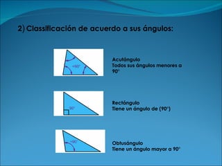 El documento clasifica los triángulos en equilátero, isósceles y escaleno según el número y longitud de sus lados. También los clasifica en agudángulo, rectángulo y obtusángulo según el tamaño de sus ángulos. Explica que la suma de los ángulos internos de cualquier triángulo es 180 grados y proporciona ejemplos para calcular ángulos desconocidos y lados mediante proporcionalidad.