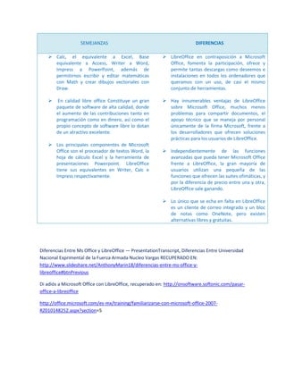 Microsoft Office es una suite de productividad de pago desarrollada por Microsoft, mientras que LibreOffice es una alternativa gratuita de código abierto disponible para múltiples sistemas operativos. Ambas ofrecen aplicaciones similares como procesador de texto, hoja de cálculo y presentaciones, pero LibreOffice es totalmente gratis, de código abierto y puede descargarse e instalarse ilimitadamente, a diferencia de la versión privativa de pago de Microsoft Office.