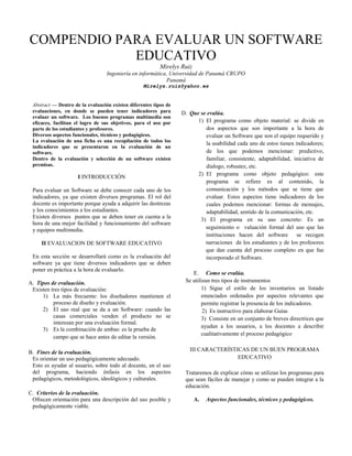 Este documento describe los diferentes aspectos que deben considerarse para evaluar software educativo de manera efectiva. Explica que la evaluación debe analizar aspectos funcionales, técnicos y pedagógicos del software, así como su facilidad de uso e instalación. También destaca la importancia del rol del docente en guiar a los estudiantes y proporcionar los conocimientos necesarios para sacar el máximo provecho del software.