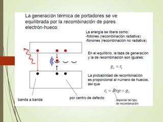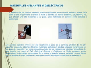 El documento describe los diferentes tipos de materiales desde el punto de vista eléctrico, incluyendo conductores, aislantes y semiconductores. Explica que los semiconductores como el silicio, el germanio y el selenio tienen características intermedias entre conductores y aislantes, y pueden conducir electricidad bajo ciertas condiciones. Los semiconductores se utilizan comúnmente en dispositivos electrónicos como diodos, transistores y circuitos integrados.