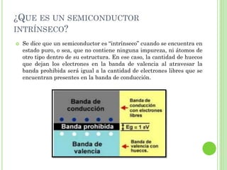 Este documento explica los conceptos de semiconductores intrínsecos y dopados. Los semiconductores intrínsecos son puros y tienen la misma cantidad de electrones y huecos. Los semiconductores dopados tienen impurezas agregadas intencionalmente para cambiar sus propiedades eléctricas, usando materiales donantes tipo N o aceptores tipo P. El dopaje leve agrega una impureza cada 100 millones de átomos, mientras que el dopaje pesado agrega una cada 10,000 átomos.