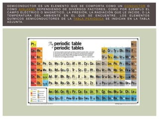 Este documento describe los diferentes tipos de semiconductores, incluyendo semiconductores intrínsecos, semiconductores extrínsecos tipo N y tipo P. Los semiconductores intrínsecos tienen igual número de electrones y huecos, mientras que los semiconductores extrínsecos se dopan agregando impurezas que aumentan el número de electrones (tipo N) o huecos (tipo P), haciéndolos conductores. También explica brevemente el dopaje en polímeros conductores.