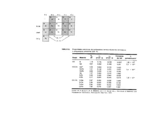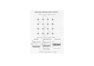 El documento trata sobre los semiconductores. Explica la estructura de bandas de energía en los cristales y cómo esto determina si son conductores, dieléctricos o semiconductores. Luego describe la estructura de bandas en semiconductores intrínsecos como el silicio y germanio, y cómo se generan pares electrón-hueco térmicamente. Finalmente, introduce los semiconductores dopados tipo p y tipo n, y cómo las impurezas afectan su estructura de bandas y propiedades eléctricas.