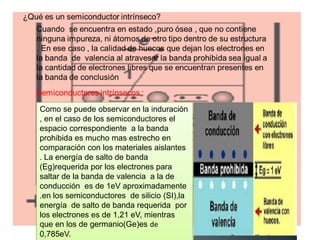 Un semiconductor es un material que puede comportarse como un conductor o un aislante dependiendo de factores como el campo eléctrico, la temperatura o la presión. Los semiconductores más comunes son el silicio y el germanio, los cuales forman una red cristalina tetraédrica. Los semiconductores pueden ser intrínsecos o dopados mediante la adición de pequeñas cantidades de impurezas, lo que permite controlar el tipo de portadores mayoritarios (electrones o huecos) y mejorar su conductividad.
