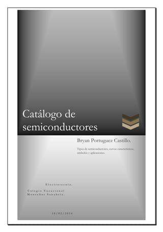 Este documento describe diferentes tipos de semiconductores, incluyendo sus símbolos, curvas características y aplicaciones. Describe semiconductores tipo P y N, diodos como diodos semiconductores, diodos túnel, fotodiodos y diodos Zener. También describe dispositivos como SCR, DIAC, TRIAC, BJT, FET, MOSFET, UJT, 555, IGBT y GTO.