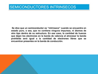El documento describe los semiconductores intrínsecos y el proceso de dopaje para crear semiconductores extrínsecos. Los semiconductores intrínsecos son puros y tienen la misma cantidad de electrones y huecos. El dopaje involucra agregar pequeñas cantidades de impurezas como el fósforo o el boro para crear un exceso de electrones (tipo N) u huecos (tipo P), respectivamente. Esto hace que los electrones o huecos sean los portadores de carga mayoritarios y determina si el material se comporta como un semiconductor de tipo N o