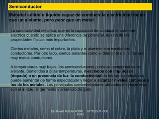 El documento describe las propiedades de los semiconductores. Explica que los semiconductores pueden conducir electricidad mejor que los aislantes pero peor que los metales. También describe los semiconductores intrínsecos y extrínsecos (dopados), y cómo la conductividad de los semiconductores puede aumentar con la temperatura, dopaje o luz. Finalmente, explica brevemente cómo funciona un diodo semiconductor formado por la unión de un semiconductor tipo P y uno tipo N.