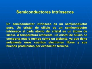 Este documento describe los semiconductores intrínsecos y extrínsecos. Los semiconductores intrínsecos son puros, como el silicio puro. A temperatura ambiente se comportan como aislantes, con pocos electrones libres. Los semiconductores extrínsecos tienen impurezas que los dopan, haciéndolos tipo N o tipo P. Los tipo N tienen más electrones como portadores mayoritarios, mientras que los tipo P tienen más huecos como portadores mayoritarios.