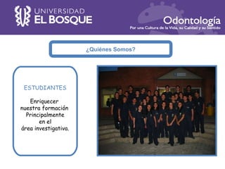 Este documento presenta la información básica sobre un semillero de investigación en odontología de la Universidad El Bosque. El semillero busca enriquecer la formación de estudiantes a través de la investigación, liderar grupos de investigación dentro y fuera de la universidad, e integrarse en redes de investigación nacionales e internacionales. El semillero se fundó en 2005 y desde entonces ha participado en numerosos congresos y ha desarrollado varios proyectos de investigación con docentes y otros grupos.