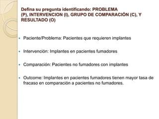 Este documento presenta la búsqueda de información realizada por un alumno sobre el pronóstico de los implantes dentales en pacientes fumadores versus no fumadores. El alumno define la pregunta de investigación utilizando los elementos PICO, realiza una búsqueda en PubMed utilizando términos MeSH y límites, y selecciona 3 artículos relevantes. El artículo seleccionado concluye que el tabaquismo es uno de los principales factores de riesgo que afectan la tasa de éxito de los implantes