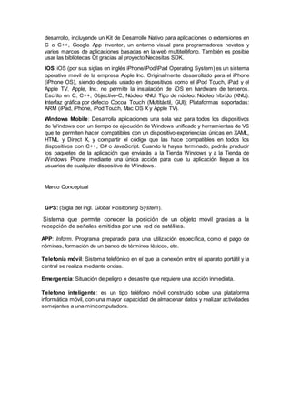 Este documento describe los componentes necesarios para el desarrollo de una aplicación móvil para emergencias que incluye un visor geográfico. Se detalla el uso de sistemas de información geográfica como ArcGIS, así como los sistemas operativos móviles Android e iOS. También se explican brevemente conceptos como GPS, aplicaciones y teléfonos inteligentes en el contexto de las emergencias.