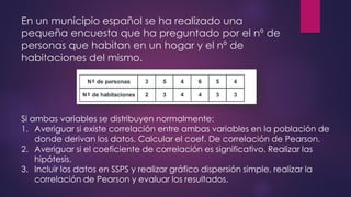 Este documento resume los pasos para analizar la correlación entre el número de personas que habitan en un hogar y el número de habitaciones del mismo usando el coeficiente de Pearson. Calcula un coeficiente de correlación de 0.633 pero determina que no es estadísticamente significativo dado que el valor p de 0.177 es mayor que 0.05, por lo que no existe evidencia de una relación entre las dos variables.