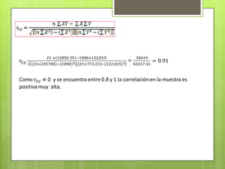 Este documento describe un ejercicio para determinar si existe una correlación entre la edad y el peso de una muestra de niños. Se proporciona una tabla de datos que incluye la edad en días y el peso en kg de varios niños. El documento explica que se debe calcular el coeficiente de correlación de Pearson entre las dos variables y determinar si este coeficiente es estadísticamente significativo.