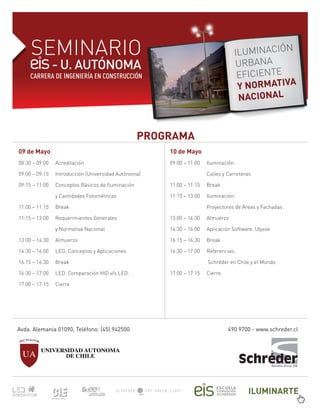 El documento presenta el programa de un seminario de dos días sobre iluminación urbana eficiente y normativa nacional. El seminario abarcará temas como conceptos básicos de iluminación, requerimientos generales y normativa, LED y su comparación con HID, y aplicaciones de software. Se realizará en la Universidad Autónoma y contará con presentaciones, breaks y almuerzo.