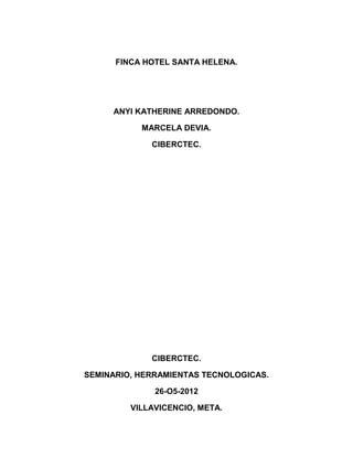 El documento presenta un proyecto para mejorar los servicios y promover la cultura y el cuidado ambiental en la Finca Hotel Santa Helena en Villavicencio, Meta. El proyecto busca organizar mejor al personal, capacitarlos sobre la cultura llanera y fomentar prácticas sostenibles. Se realizó un estudio de mercado sobre hábitos locales para ofrecer nuevas actividades a los turistas basadas en la cultura de la región.