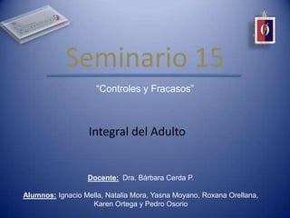 El documento presenta información sobre diferentes tipos de alta en odontología, incluyendo alta educativa, preventiva, integral, voluntaria, forzosa, disciplinaria. También describe controles odontológicos y su importancia para supervisar tratamientos, captar problemas tempranamente y mejorar la salud bucal. Finalmente, analiza conceptos como fracaso e iatrogenia en odontología, señalando que el fracaso se refiere a no cumplir los objetivos del tratamiento, mientras que la iatrogenia es un daño causado