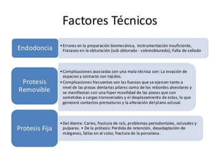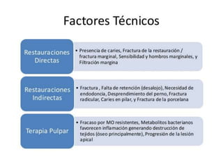 El documento resume los factores que influyen en la evolución de un paciente después del alta, incluyendo factores biológicos, mecánicos-funcionales, psicosociales, físicos y técnicos. También describe la importancia de los controles posteriores al tratamiento para evaluar la efectividad del tratamiento y prevenir deterioros. Se presenta un índice de mantenimiento integral para evaluar objetivamente la salud del paciente en controles, considerando parámetros de periodoncia, restauraciones, endodoncia, higiene oral y ATM