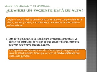 El documento trata sobre los conceptos de salud, modelos biomédico y biosicosocial, y los tipos de altas y controles en odontología. Define salud como un estado de bienestar físico, mental y social según la OMS. Explica que el modelo biomédico se enfoca en lo individual mientras que el modelo biosicosocial incluye factores biológicos, psicológicos y sociales. También describe los diferentes tipos de altas odontológicas y la importancia de los controles posteriores al tratamiento.