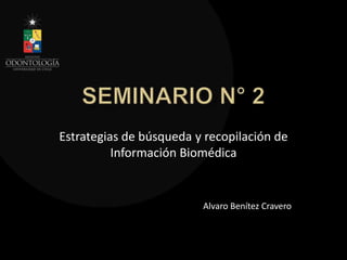El documento describe estrategias para buscar y recopilar información biomédica sobre la colocación de implantes dentales con carga inmediata. Inicialmente se realizó una búsqueda que arrojó 64,200 resultados. Luego se buscó en Clinical Queries de Pubmed, obteniendo resultados más acotados al tema. Finalmente, el documento concluye que la colocación de implantes con carga inmediata requiere un riguroso diagnóstico, planificación y procedimiento quirúrgico limpio.
