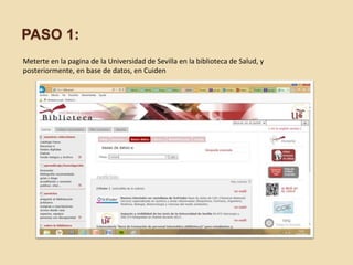 El documento describe una búsqueda de artículos sobre cuidados de enfermería para prevenir úlceras por presión en la población geriátrica en las bases de datos Cuiden y Dialnet. Se incluyen capturas de pantalla de las búsquedas realizadas con palabras clave, y una bibliografía con 5 referencias de cada base de datos. También se muestran las primeras páginas de dos artículos completos seleccionados de cada base de datos.