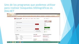 Este documento describe cómo realizar búsquedas bibliográficas utilizando dos programas: DIALNET y CUIDEN PLUS. Explica los pasos para buscar información sobre cuidados de enfermería para prevenir úlceras por presión en personas mayores, seleccionar artículos relevantes e importarlos a RefWorks para crear una bibliografía.