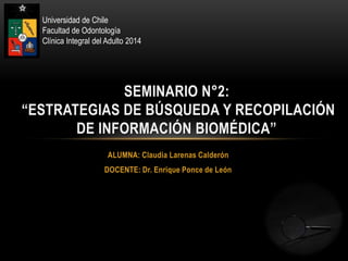 Este documento presenta un resumen del seminario "Estrategias de búsqueda y recopilación de información biomédica" de la estudiante Claudia Larenas. Como parte del seminario, Claudia planteó la pregunta "¿En un paciente con periodontitis agresiva debo o no indicar antibióticos orales además del tratamiento periodontal no quirúrgico?". Para responder esta pregunta, Claudia realizó búsquedas en Google y PubMed usando la estrategia PICOT. Ambas búsquedas arrojaron estudios