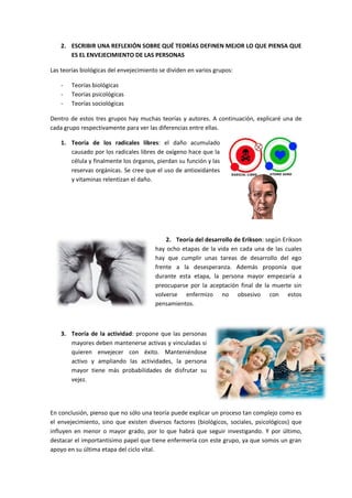El documento discute el envejecimiento saludable versus el envejecimiento enfermo. Define el envejecimiento activo como mantenerse saludable, participativo y seguro a medida que se envejece. Explica que el envejecimiento normal incluye cambios físicos y mentales, pero que la vejez no debe verse como una enfermedad sino otra etapa de vida. Además, analiza teorías biológicas, psicológicas y sociológicas sobre el envejecimiento.