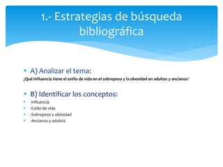 El documento analiza la influencia del estilo de vida en el sobrepeso y la obesidad en adultos y ancianos. Presenta los conceptos clave como influencia, estilo de vida, sobrepeso, obesidad, adultos y ancianos. Propone una estrategia de búsqueda bibliográfica utilizando operadores booleanos, truncamiento y comillas para interrogar bases de datos sobre artículos de los últimos 5 años sobre este tema. Finalmente, lista 5 referencias bibliográficas encontradas.