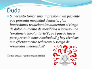 Este documento describe los pasos que una estudiante tomó para buscar información sobre técnicas de impresión dental para pacientes con movilidad dentaria. La estudiante formuló una pregunta de investigación y buscó en Google y PubMed, pero encontró pocos artículos relevantes de alto nivel. Aunque se encontraron algunas técnicas alternativas, no se pudo concluir si estas reducen efectivamente el riesgo de dolor o pérdida dental en comparación con métodos tradicionales.