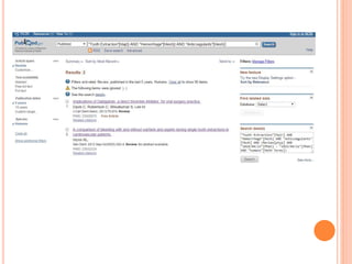 Este documento presenta una pregunta clínica sobre si se debe suspender la terapia anticoagulante oral en pacientes que requieren una exodoncia para evitar hemorragias durante la cirugía. Se define el problema utilizando el formato PICOT y se realizan búsquedas en Google y PubMed usando palabras clave como "exodoncia", "anticoagulante oral" y "hemorragia". Finalmente, se compara ambas bases de datos en términos de tiempo de búsqueda, facilidad de uso, cantidad y calidad de resultados.