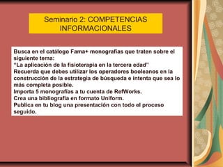 Este documento describe los pasos para realizar una búsqueda bibliográfica sobre la aplicación de la fisioterapia en la tercera edad utilizando la base de datos Fama+, importar 5 monografías a RefWorks y crear una bibliografía en formato Uniform. Se detallan los pasos de realizar la búsqueda con operadores booleanos, agregar los artículos seleccionados a la cesta, introducir el código de usuario en RefWorks, crear una nueva carpeta y bibliografía en formato Uniform.